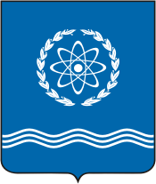 Герб города Обнинск - Герб утвержден в 2005 г., в 2006 г. в него были внесены изменения (убраны внешние обрамления герба). Геральдическое описание герба: "В лазоревом поле безант в окружении четырех переплетенных звеньев, сопровождаемых по сторонам двумя изогнутыми наподобие венка лавровыми ветвями, а в оконечности - тройным волнистым нитевидным поясом. Все фигуры серебряные".